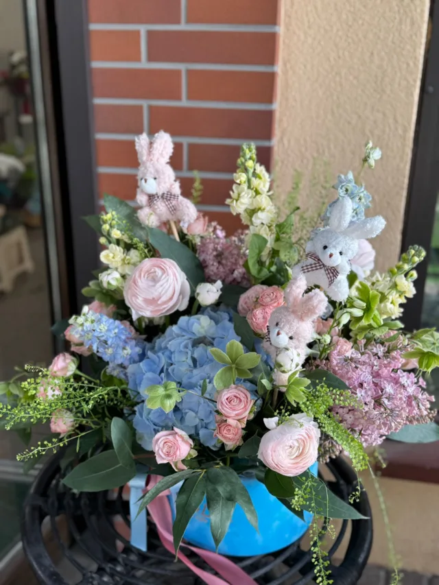 Aranjamentul contine 3 fire liliac, 2 Hortensia, 5 Minirosa , 7 ranunculus, 5 Mathiola, 5 heloborus si 5 delphinium.