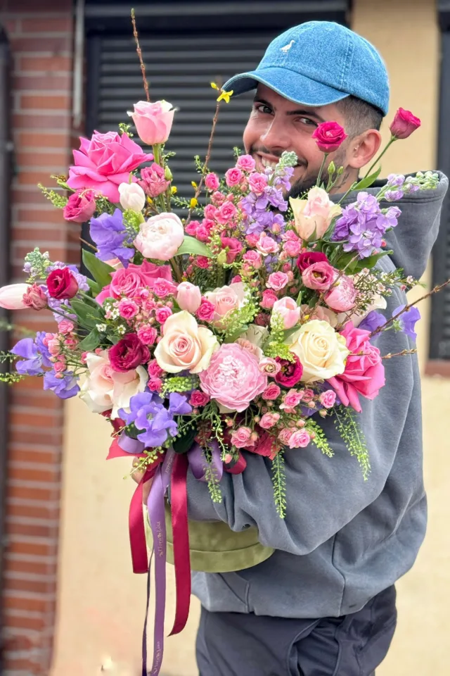 Aranjament în cutie de catifea: un cadou floral deosebit. Acest aranjament elegant combină trandafiri, bujori, lalea, minirosa, latirus, lishianthus și wax flower. Perfect pentru orice ocazie, oferă rafinament și farmec natural. Comandă acest buchet luxos în cutie de catifea!