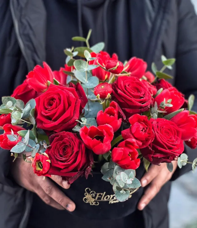 Aranjament floral premium, perfect cadoul care vorbește din inimă. Cutie elegantă cu trandafiri, ranunculus și lalele roșii, însoțite de eucalipt. Ideal pentru aniversări, declarații de dragoste sau pentru a lumina orice interior. Comandă acum și surprinde cu magia culorii și a rafinamentului!
