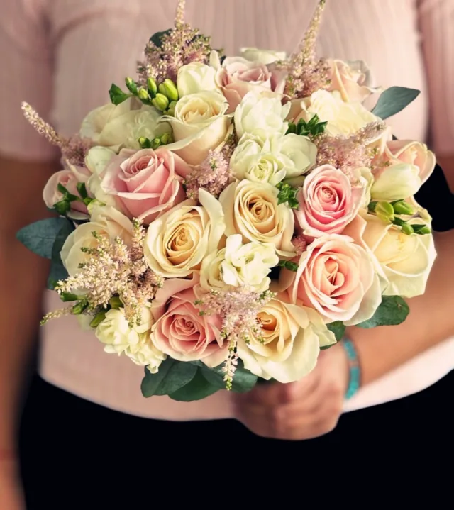 Buchet de mireasă romantic și delicat, perfect pentru nunți și evenimente. Combinație rafinată de trandafiri crem și roz, însoțită de frezii, astilbe și eucalipt pentru textură și volum. Un buchet de nuntă elegant, proaspăt și memorabil, creat să completeze ținuta miresei. la eveniment.