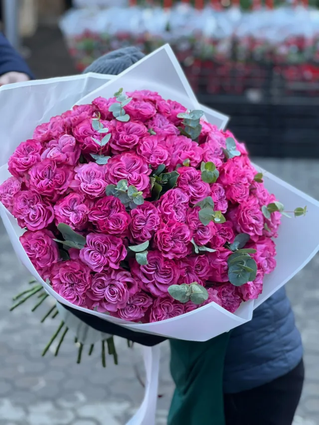 Buchetul „Soapta de Trandafir” – o declarație rafinată de dragoste. Acest aranjament floral elegant combină trandafiri albi și roz cu verdeața fină de eucalipt. Ideal pentru momente speciale, transmite admirație și afecțiune pură.